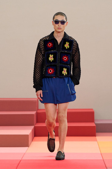 Nos calçados, as sandálias Arco slingback com salto bloco receberam partes em tricô e correntes entrelaçadas a couro, em diálogo com mocassins e sapatilhas de treliça. As joias de Delfina Delettrez trabalharam o contraste entre metal e cor: ear cuffs esmaltados, abotoaduras em filigrana dourada e brincos em coral reforçaram a atmosfera lúdica.